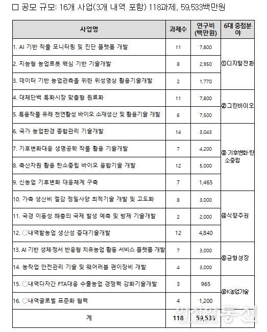 6대 분야는 다음과 같다. △미래 스마트농업 확산: 인공지능(AI) 기반 작물 모니터링 및 진단 플랫폼 개발, 위성영상 활용 기술 등(21과제, 약 125억 원) △바이오 및 푸드테크 산업 육성: 대체단백 특화시장 맞춤형 원료화, 특용작물 유래 바이오 소재 생산 등(17과제, 약 153억 원) △기후변화 및 탄소중립 대응: 축산자원 활용 탄소중립 기술, 신농업 기후변화 대응체계 구축 등 (40과제, 약 137억 원) △식량주권 확보: 밭농업 생산성 증대 기술, 가축 생산비 절감 정밀 사양 최적 기술 등 (22과제, 약 98억 원) △지역 균형성장 및 안전·행복한 농촌: 치유농업 활동 서비스 플랫폼 개발, 농작업 안전관리 및 웨어러블 장비 개발 등(11과제, 약 60억 원) △ 케이(K) 농업 국제적(글로벌) 확산: 다자간 자유무역협정(FTA) 대응 수출농업 경쟁력 강화 기술, 국제 표준화 협력 등(7과제, 약 22억 원)