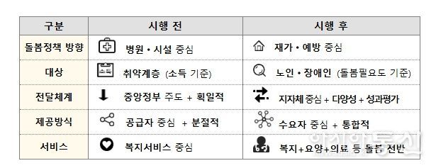 우선 돌봄의 중심이 병원·시설에서 재가·예방으로 옮겨져, 입원·입소 경계선상의 노인·장애인 등이 살던 곳에서 필요한 서비스를 지원받을 수 있게 된다. 소득 기준 중심의 지원에서 벗어나, 노인·장애인의 돌봄 필요도를 기준으로 서비스를 연계해 제공함으로써 사각지대를 줄인다.