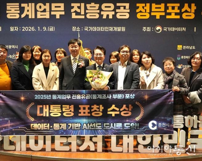 [아시아통신] 춘천시가 9일 2025년 통계업무 유공을 인정받아 강원특별자치도 18개 시군 중 최초로 대통령 표창을 수상했다.