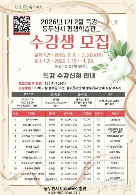 [아시아통신] 동두천시는 시민의 자기계발과 평생학습 참여 기회를 확대하기 위해 2026년 평생학습관 2월 특강 수강생을 모집한다고 밝혔다.