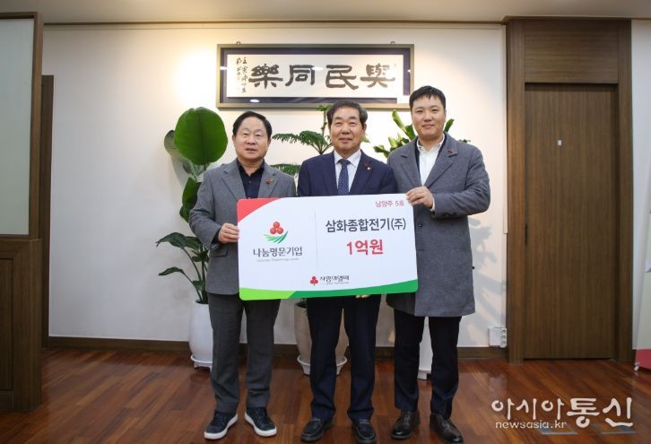 [아시아통신] 남양주시는 14일 삼화종합전기가 사회복지공동모금회의 고액 기부 프로그램인 ‘나눔명문기업’ 5호로 가입하고, 지역 내 취약계층 지원을 위해 1억 원 기부를 약정했다고 밝혔다.