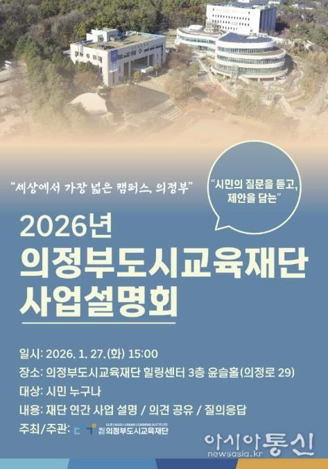 [아시아통신] 의정부도시교육재단은 1월 27일 오후 3시, 재단의 연간 사업 방향을 시민들과 공유하고 의견을 나누기 위한 '2026년 의정부도시교육재단 사업설명회'를 개최한다.