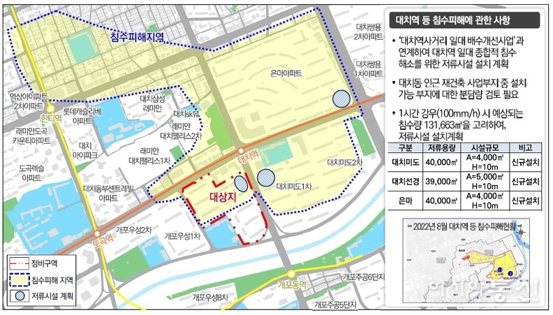 재건축을 앞둔 강남구 대치역사거리 인근 미도․은마․선경아파트는 지난해 정비사업과 연계한 ‘공공기여’ 방식으로 약 11만 9천 톤 규모 저류시설을 공동 설치․부담하는 방안을 마련했다. 이들 단지는 개발사업에서 발생한 이익으로 주거지 일대 침수를 막아줄 기반시설을 확충하고 사전에 재난 예방시설을 확보한 모범 사례로 평가받고 있다.