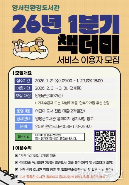 모집 대상은 양평군 도서관 대출회원 중 어린이 자녀를 둔 40가정이며, 기초생활수급자 및 차상위계층, 한부모 가정은 우선 선정 대상에 포함된다. 신청은 1월 21일 오전 9시부터 온라인(네이버 폼)을 통해 선착순으로 진행된다.
