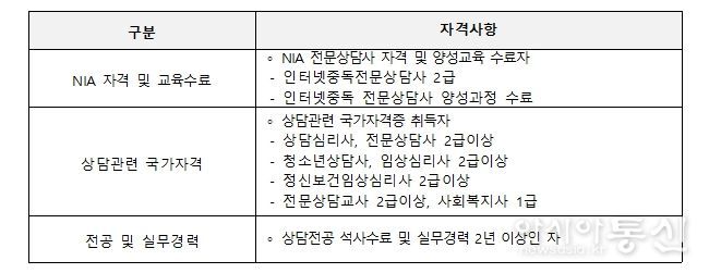 선발 자격은 ▲한국지능정보사회진흥원 시행 인터넷 중독 전문상담사 2급 자격증 소지자 ▲인터넷중독 전문인력 양성교육 이수자 등 관련 자격을 갖춘 인력이다.