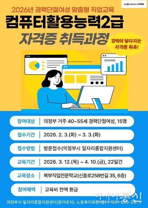 [아시아통신] 의정부시는 경력단절여성의 취업역량 강화를 위해 2월 3일부터 3월 3일까지 ‘컴퓨터활용능력2급 자격증 취득과정’ 참여자를 모집한다.