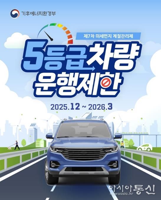 [아시아통신] 파주시는 제7차 계절관리제 기간인 2025년 12월부터 2026년 3월까지 배출가스 5등급 차량에 대한 단속을 실시하고 있다.