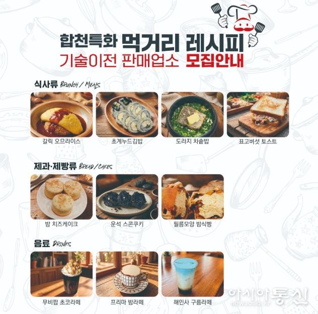 [아시아통신] 합천군은 지역 특산물을 활용한 차별화된 먹거리를 보급하고 관광객들에게 풍성한 미식 경험을 선사하기 위해 ‘합천특화 먹거리 레시피 기술이전 및 판매업소’를 2026년 1월 19일 월요일부터 2월 20일 금요일까지 모집한다고 밝혔다.