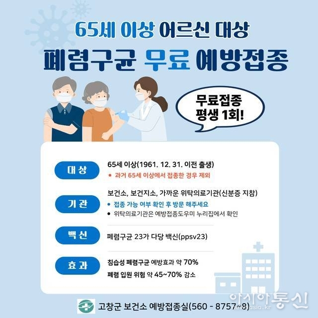전북 고창군이 65세 이상 어르신 건강 보호와 감염병 예방을 위해 폐렴구균 예방접종을 무료로 지원합니다.