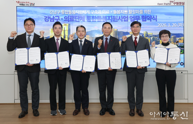 꿈이 모이는 도시, 미래를 그리는 강남구(구청장 조성명)가 1월 20일 관내 5대 의료단체(강남구 의사회·치과의사회·한의사회·약사회·간호사회)와 ‘강남구 통합돌봄지원체계 구축을 위한 의료·요양 통합돌봄지원사업 업무협약(MOU)’을 체결했다.