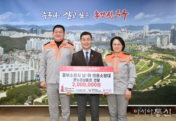 [아시아통신] 울산 중부소방서 남성의용소방대(대장 이창호) 및 여성의용소방대(대장 김대희)가 1월 20일 오후 4시 30분 중구청 구청장실을 찾아 울산사회복지공동모금회를 통해 이웃돕기 후원금 200만 원을 전달했다.
