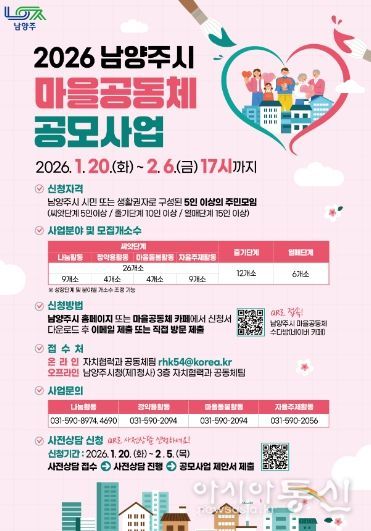 [아시아통신] 남양주시는 1월 20일부터 2월 6일까지 ‘2026년 마을공동체 공모사업’참여 공동체를 공개 모집한다.