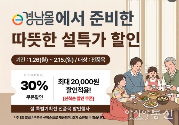 [아시아통신] 경상남도와 (재)경상남도투자경제진흥원이 운영하는 e경남몰은 1월 26일부터 예산 소진 시까지 ‘2026년 풍성한 설맞이 할인 기획전’을 진행한다.