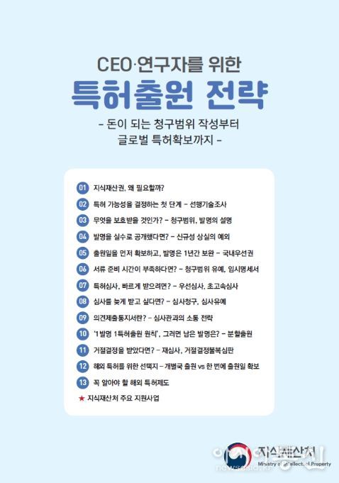 지식재산처 정연우 특허심사기획국장은 “이번 안내서는 기업 CEO와 연구자들이 특허제도를 쉽게 이해하고 실무에 바로 활용할 수 있도록 최대한 얇고 간결하게 구성했다”며, “스타트업을 비롯한 기업과 연구기관에서 본 자료를 적극 활용하고 널리 공유하여, 더 많은 연구 성과가 글로벌 특허 확보로 연결되길 바란다”고 밝혔다.