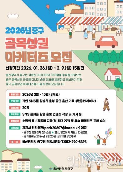 [아시아통신] 울산 중구가 골목상권의 매력을 알리는 데 앞장설 ‘2026년 중구 골목상권 마케터즈’를 모집한다.