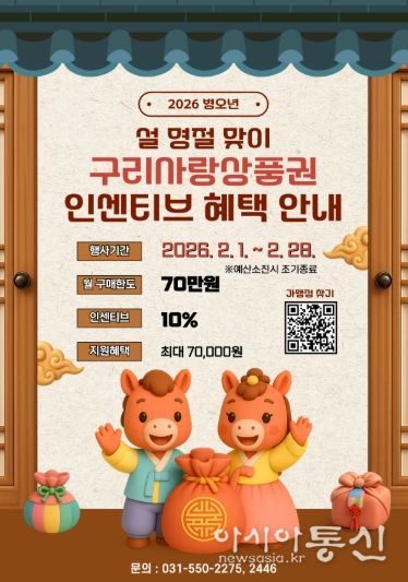 [아시아통신] 구리시는 설 명절을 맞아 지역 내 소비 촉진과 소상공인 매출 증대를 위해 2월 한 달간 구리사랑상품권 특별 인센티브를 10%로 확대 지원한다고 밝혔다. 이번 특별 인센티브는 1인당 월 구매 한도 70만 원까지 적용되며, 예산 소진 시 조기 종료될 수 있다.