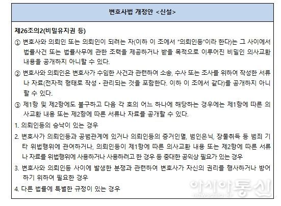 개정안은 ‘변호사와 의뢰인이 주고받은 법률상담 내용’이나, ‘변호사가 작성한 의견서’ 등을 비밀유지권으로 보호하고, ‘의뢰인이 공개에 동의한 경우’, ‘범죄와 관련되어 있는 경우’ 등 비밀유지권이 인정되지 않는 예외 사유를 규정하는 것을 주요 내용으로 한다.