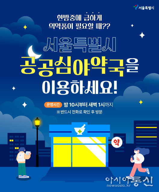서울시는 늦은 밤 갑작스러운 증상으로 어려움을 겪는 시민을 위해 밤 10시부터 다음 날 새벽 1시까지 운영하는 공공심야약국을 25개 자치구, 총 39개소를 운영하고 있다. 이 중 365일 운영되는 약국은 28곳, 요일별로 운영되는 약국은 11곳이다. 요일별 운영은 월‧수‧금 등 특정 요일을 지정해서 운영하는 방식이다.