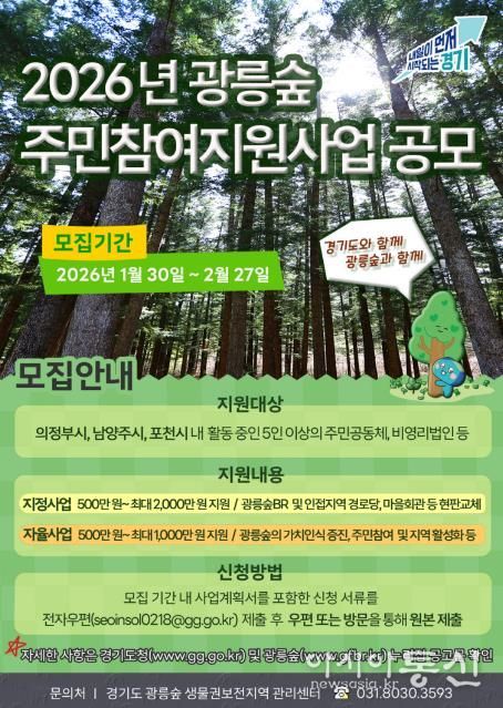 [아시아통신] 경기도가 광릉숲 생물권보전지역 활성화를 위해 2026년 광릉숲 주민참여지원사업 참여자를 모집한다.