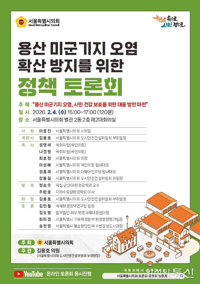 서울특별시의회 도시안전건설위원회 부위원장으로 활동하고 있는 김용호 시의원(국민의힘, 용산1)은 오는 2월 4일 오후3시 서울시의회 별관 제2대회의실에서「용산 미군기지 오염 확산 방지, 시민 건강과 보호를 위한 대응 방안 마련 토론회」를 개최해 용산 미군기지 주변 지역과 주택지의 토양·지하수 오염 실태와 정밀조사의 필요성, 현행 관리·정화 체계의 한계를 전문가 논의를 통해 종합적으로 살펴볼 예정이다.