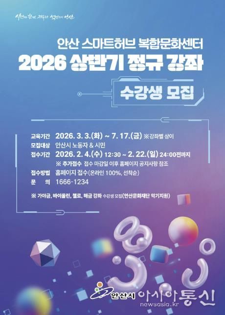 [아시아통신] 안산시 스마트허브복합문화센터는 오는 4일부터 상반기 정규강좌 수강생을 모집한다고 3일 밝혔다.