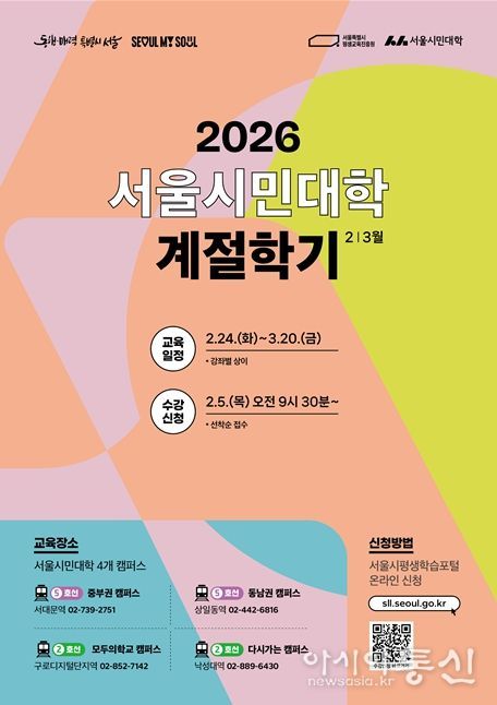 [아시아통신] 서울시평생교육진흥원이 2026년 열정과 도전을 상징하는 ‘붉은 말의 해’ 병오년(丙午年)을 맞아 총 45개의 계절학기 프로그램을 개설하고, 2월 5일 오전 9시 30분부터 학습자를 선착순 모집한다.