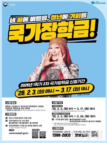 [아시아통신] 교육부와 한국장학재단(이사장 배병일)은 2월 3일부터 3월 17일까지 2026학년도 국가장학금 1학기 2차 신청을 받는다.