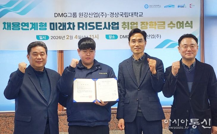 [아시아통신] 경상국립대학교는 2월 4일 오전 11시 함안군에 소재한 원강산업(주) 회의실에서 ‘채용연계형 미래차 RISE사업 취업 장학금 수여식’을 개최했다.