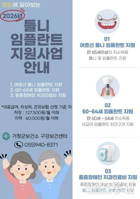 [아시아통신] 거창군 보건소는 오는 9일부터 27일까지 치아 상실로 식사와 일상생활에 불편을 겪고 있는 저소득층을 대상으로 틀니, 임플란트 지원사업 신청을 받는다.