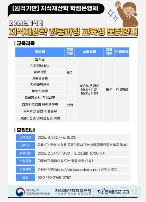 [아시아통신] 지식재산처 국제지식재산연수원은 한국발명진흥회와 공동으로 2월 5일부터 23일까지 지식재산학 학점은행 과정에 대한 온라인 수강생을 모집한다.