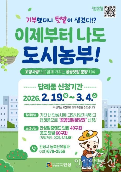 [아시아통신] 안성시는 오는 2월 19일부터 고향사랑기부제를 통해 도시농업을 체험하는 ‘도시농부’를 모집한다고 밝혔다.
