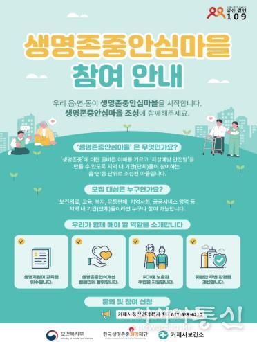 올해 생명존중안심마을은 기존에 운영 중인 사등면과 장목면에 더해 아주동, 장평동, 고현동, 옥포2동을 추가 선정해 총 6개 면·동으로 확대 된다.