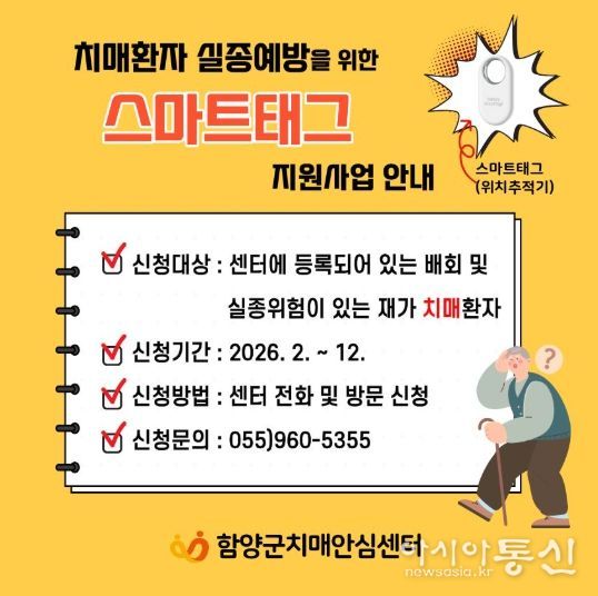 [아시아통신] 함양군치매안심센터는 치매 환자의 실종을 예방하고 위급 상황 발생 시 신속한 발견을 돕기 위해 위치 확인을 할 수 있는 ‘스마트 태그’를 무상으로 지원한다고 밝혔다.