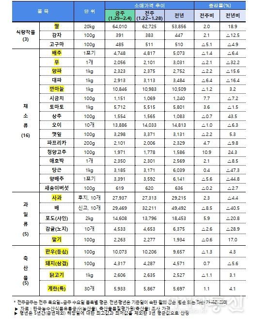 수급 점검 결과 전반적인 설 성수품 가격은 전년 수준으로 비교적 안정적인 흐름을 보이고 있고, 설 차례상 비용도 전년보다 소폭 하락했다. 다만, 대과 위주의 선물용 사과와 지난해 가격이 낮았던 쌀과 한우는 다소 높은 수준을 보이고 있다.