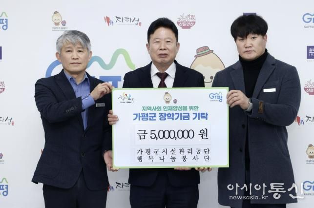 [아시아통신] 가평군 교육 발전을 향한 군민들의 관심이 이어지고 있는 가운데, 가평군시설관리공단이 9일 군청을 방문해 장학기금 500만원을 전달했다.