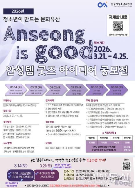 [아시아통신] 안성시청소년수련관은 청소년이 지역 문화유산을 창의적인 굿즈로 재해석하는 '2026 청소년이 만드는 문화유산 ‘안성템 굿즈 아이디어 공모전’'을 개최하고, 오는 3월부터 참가 청소년을 모집한다고 밝혔다.