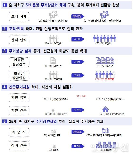 비닐하우스를 비롯한 쪽방·고시원 등 취약한 환경에서 거주 중인 시민에게 임대주택을 제공하는 ‘주거상향사업’은 2020년 7개 자치구 시범사업을 시작으로 2022년부터 전체 자치구에서 확대 운영 중이다. 지원 규모는 2020년 466건에서 2025년 5,418건으로 11배가량 늘어 시민들의 주거안전과 주거 질 개선에 기여했다는 평가다.