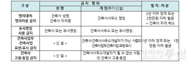 하지만 건축사사무소의 명의를 대여·차용하거나 건축사사무소 또는 이와 비슷한 명칭을 사용하는 행위, 비(非) 자격자의 건축사업무 또는 건축사업 표현·표시 및 건축사 고용·동업 행위 등에 대해서는 처벌 규정이 없어 건축 시장질서 혼란과 국민 피해가 지속되어 왔다.