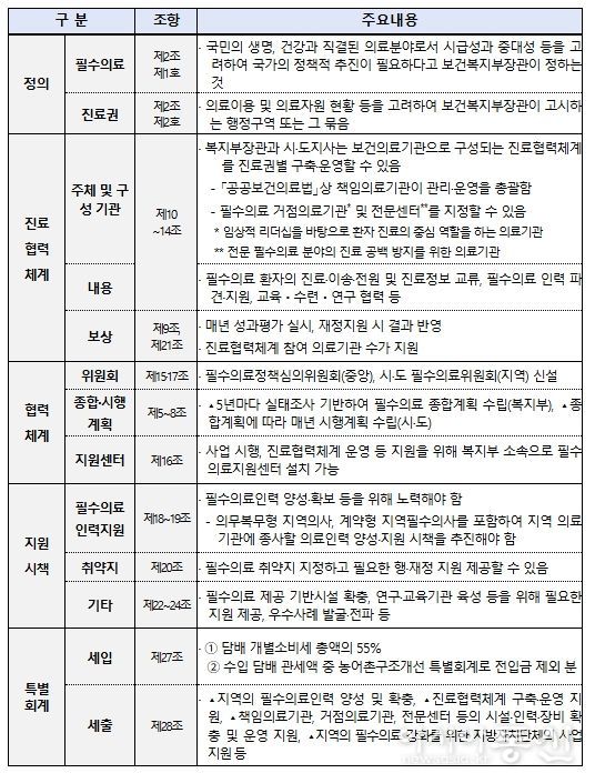 보건복지부장관은 진료권을 지정하고, 진료권별로 필수의료 진료협력체계를 구축·운영하도록 하여 지역 내 의료기관 및 인력 간 연계를 강화한다. 또한 필수의료 분야에서 일하는 보건의료인력을 체계적으로 양성하고, 확보하기 위한 지원이 강화되며, 의료서비스 제공이 어려운 취약지역에 대해서는 인프라 확충과 추가적인 지원을 통해 의료공백을 줄여 나간다.