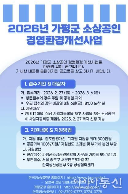[아시아통신] 가평군은 관내 소상공인의 지속경영 기반을 강화하기 위해 ‘2026년 가평군 소상공인 경영환경개선사업’ 대상자를 3월 6일까지 모집한다고 밝혔다.