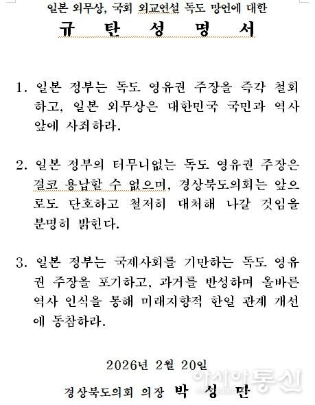 [아시아통신] 경상북도의회는 20일, 모테기 도시미쓰 일본 외무상이 일본 국회에서 독도 영유권을 주장하는 망언을 한 데 대해 강력히 항의하며, 독도는 대한민국의 고유 영토임을 재차 천명하는 성명서를 발표했다.