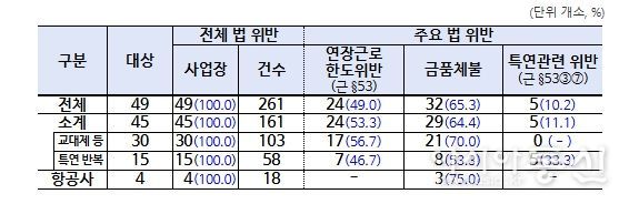 감독 결과, 4개소 전 사업장에서 총 18건의 법 위반 사항이 적발됐다. 주요 위반 내용으로는 ▴브리핑 시간 등을 제외하고 순수 비행시간만 근로시간으로 인정하는 등 야간근로수당 미지급 3개소(75.0%, 약 7억원), ▴기간제 승무원을 차별하여 비행수당 미지급 1개소(25.0%, 약 5억 5천만원), ▴산후 1년 미경과자 시간외 근로 한도 초과 2개소(50.0%) 등이 확인됐다.