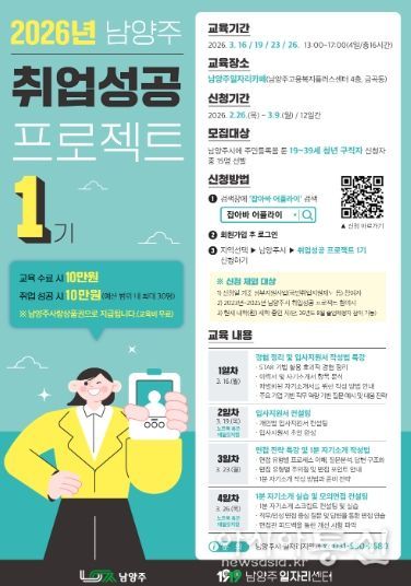[아시아통신] 남양주시는 오는 26일부터 청년 구직자의 취업 경잭력 강화를 위해 ‘2026 취업성공 프로젝트 1기’참여자를 모집한다고 밝혔다.