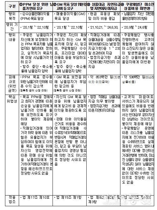 공정위는 PPM 목표 합의 및 목표 달성을 위한 납품단가 인하 요구행위와 쿠팡체험단 미소진 상품비용 미반환 행위는 '대규모유통업에서의 거래 공정화에 관한 법률'(이하 ‘법’) 제17조 제10호(불이익 제공 금지) 위반에 해당하고, GM 목표 달성을 위한 광고비 등 요구행위는 법 제15조(경제적 이익 제공 요구 금지) 위반에 해당하며, 상품대금 지연지급 및 지연이자 미지급 행위는 법 제8조(상품판매대금 등의 지급) 제2항 및 제3항 위반에 해당한다고 판단했다.