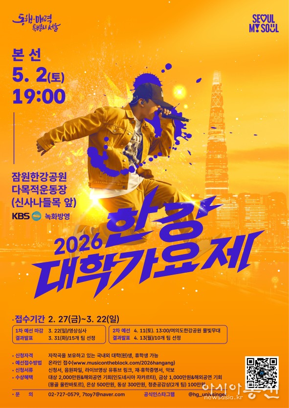 서울시가 청년 뮤지션의 등용문으로 자리 잡은 ‘2026 한강 대학가요제’ 참가자를 모집한다. 본선은 5월 2일(토) 저녁 7시, 잠원 한강공원 다목적운동장에서 열릴 예정이다.