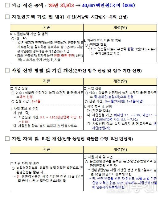 그동안 친환경직불금 지급횟수 산정 시 저농약인증(’16년 폐지) 지급 이력이 포함되어 일부 농가의 직불 참여 기회가 제한되고 신규 인증농가의 직불금 신청 요건이 현실에 맞지 않다는 등의 현장 의견이 제기되어 왔다.