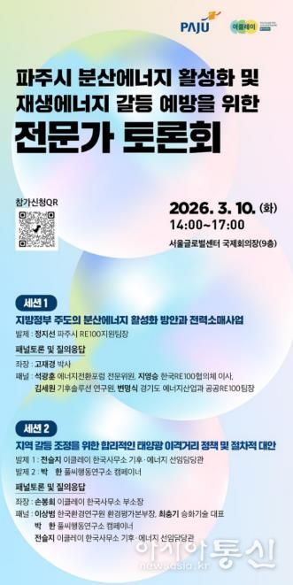 [아시아통신] 파주시는 이클레이(ICLEI) 한국사무소와 함께 오는 10일 서울글로벌센터 국제회의장에서 ‘분산에너지 활성화 및 재생에너지 갈등 예방을 위한 전문가 토론회’를 개최한다.