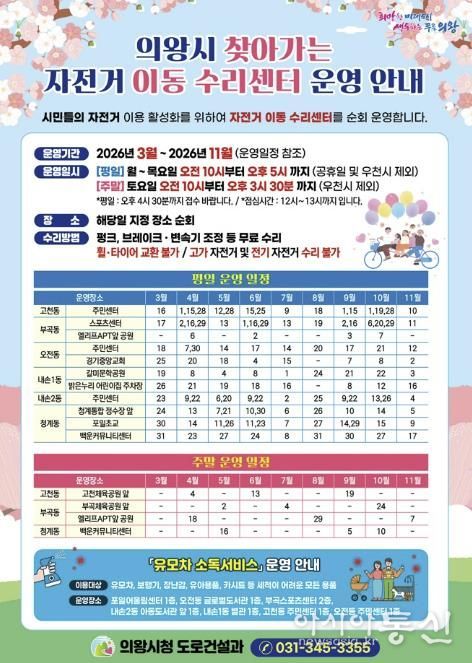 [아시아통신] 의왕시가 시민들의 자전거 이용 활성화와 안전한 자전거 문화 확산을 위해 '2026년 찾아가는 자전거 이동 수리센터'를 운영한다.
