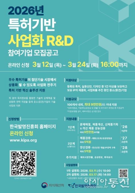[아시아통신] 지식재산처는 3월 12일~3월 24일까지 중소·중견기업의 지식재산(지식재산) 기반 제품화 및 상용화를 전폭적으로 지원하는 ‘2026년 특허 기반 사업화 연구개발(지식재산-R&BD)’ 참여기업을 모집한다고 밝혔다.