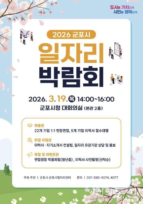 [아시아통신] 군포시는 오는 3월 19일 오후 2시부터 시청 대회의실에서 ‘2026년 군포시 일자리 박람회’를 개최한다. 이번 박람회는 지역 내 우수 기업과 구직자가 직접 만나는 채용의 장으로 제조, 서비스, 물류배송, 의료복지 등 다양한 분야에서 폭넓은 취업 기회를 제공할 예정이다.